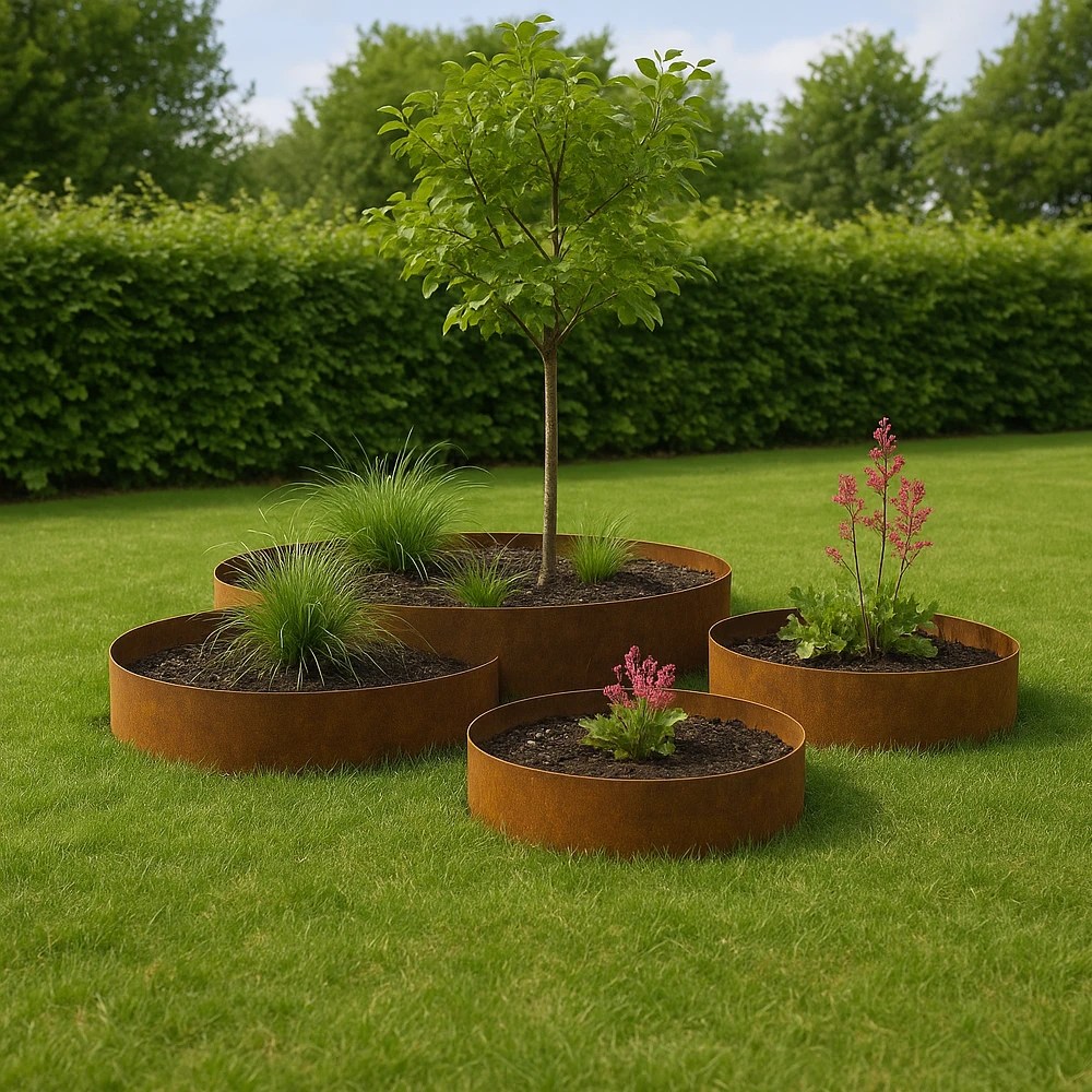 Cortenstålets karakteristiske rustrøde farve udvikles naturligt, når materialet udsættes for vind og vejr. Denne patina beskytter stålet mod gennemtæring og giver samtidig haven et elegant, levende udtryk, som kun bliver smukkere med tiden.